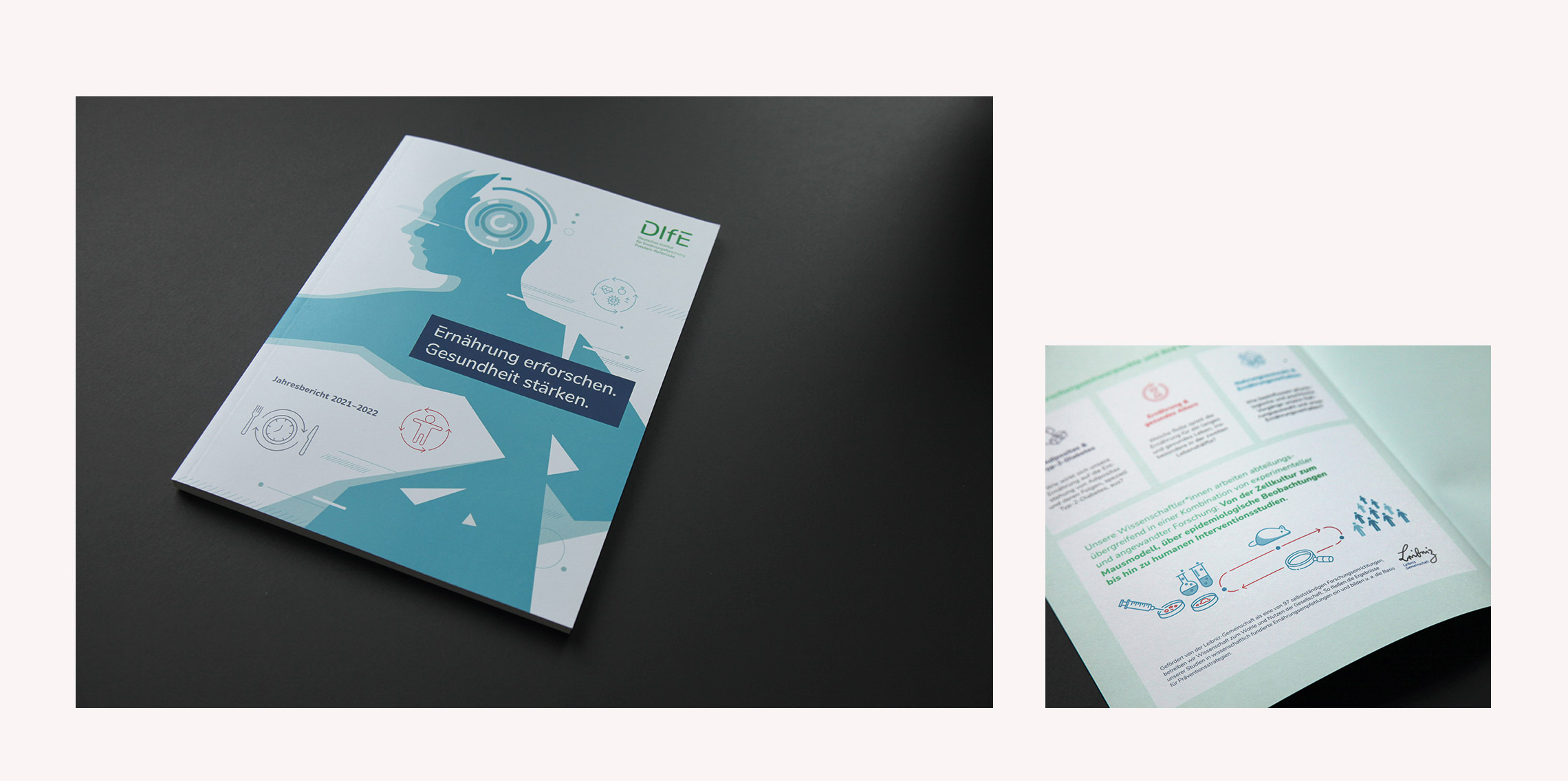 Im Anschluss an das Jubiläumsbuch widmeten wir uns der Gestaltung des Jahresberichts 2021 – 2022 des Deutschen Instituts für Ernährungsforschung. Ein besonderer Fokus dieser Publikation liegt auf Ernährung, Gesundheit und Wohlbefinden in Zusammenhang mit der Corona-Pandemie.