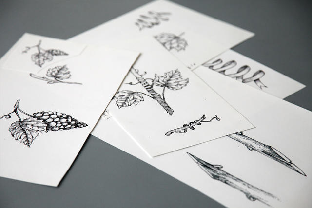 Angelehnt an Kupferstiche aus dem 18. Jahrhundert wurden Tuschezeichnungen zum Thema entwickelt, die sich als Gestaltungselemente und Muster auf allen Unterlagen wiederfinden.