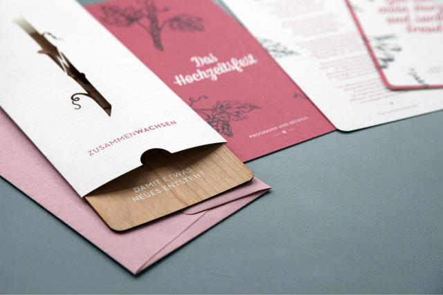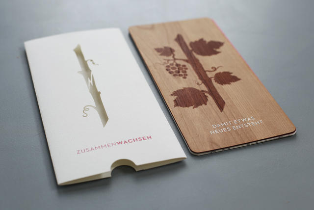 Die Einladung wurde in 2 Schritten verschickt: Zuerst eine Save the Date-Karte mit Anteasern der Metapher "Weinveredelung und Verbindung fürs Leben".