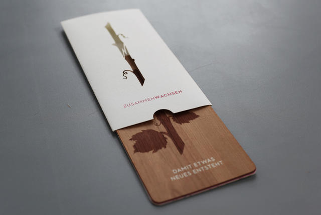 Der Lasercut ermöglicht eine authentische Holzoptik der Rebe, da die innenliegende Holzkarte durchscheint