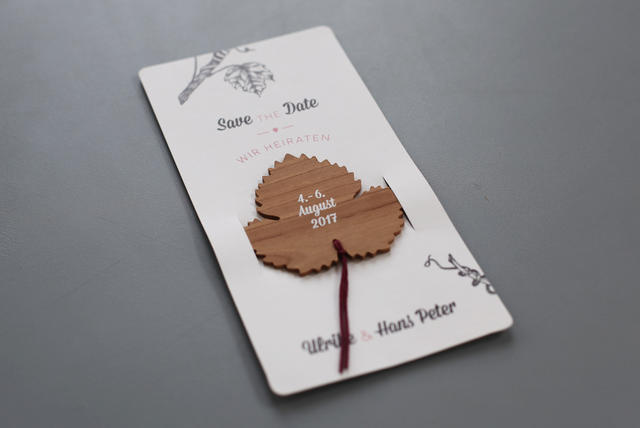 Save the Date - Karte: Lasercut, Weißdruck auf Holz, handgefertigte Tuschezeichnung